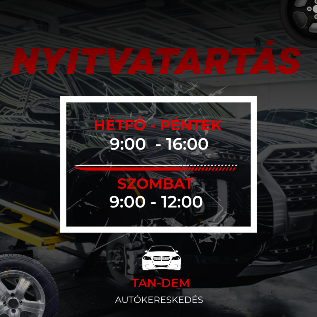 Autókereskedésünk a feltüntetett nyitvatartási rend szerint üzemel.